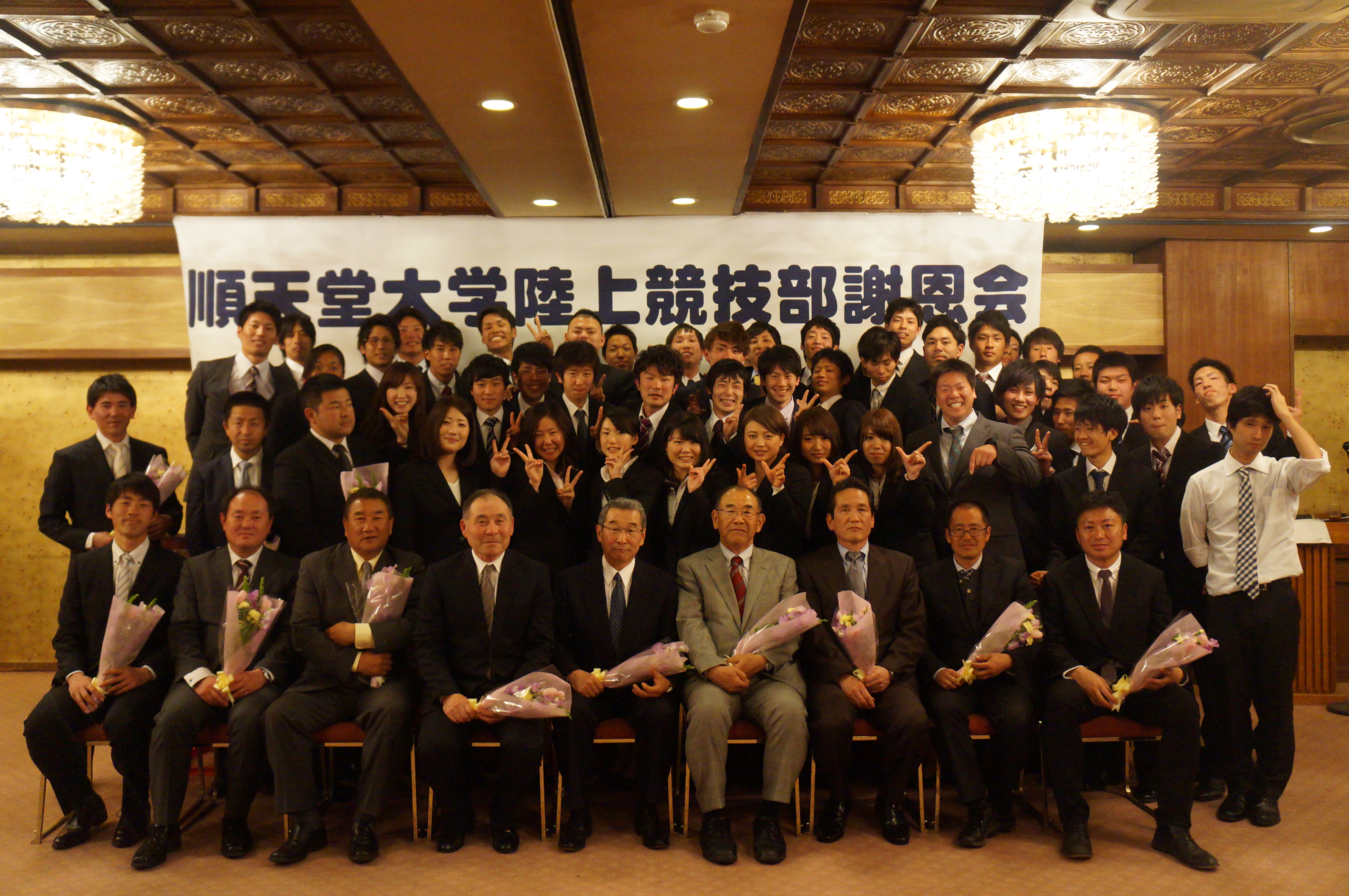 平成25年度順天堂大学陸上競技部謝恩会を行いました。 投稿者:編集者 投稿公開日:2014年3月24日 投稿カテゴリー:What's New 3月19日(水)に平成25年度順天堂大学陸上競技部謝恩会が行われました。 男子59代38名、女子20代9名の学生が陸上競技部を旅立ちました。 1年目に日本インカレ総合優勝を経験し、2年目に箱根駅伝予選会から本戦へ出場・シード獲得、 4年目に日本インカレ3位、女子4位(過去最高タイ)という成績を残してきました。 4年間お疲れ様でした。 今後の活躍を期待しています。 おすすめ 日本インカレ photo ~フィールド・混成~ 2016年9月24日 【第84回日本学生陸上競技対校選手権大会】結果を掲載しました 2015年9月15日 全日本インカレ 代表選手について 2013年8月22日